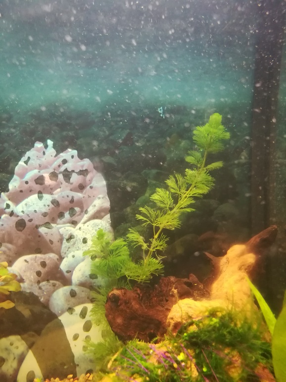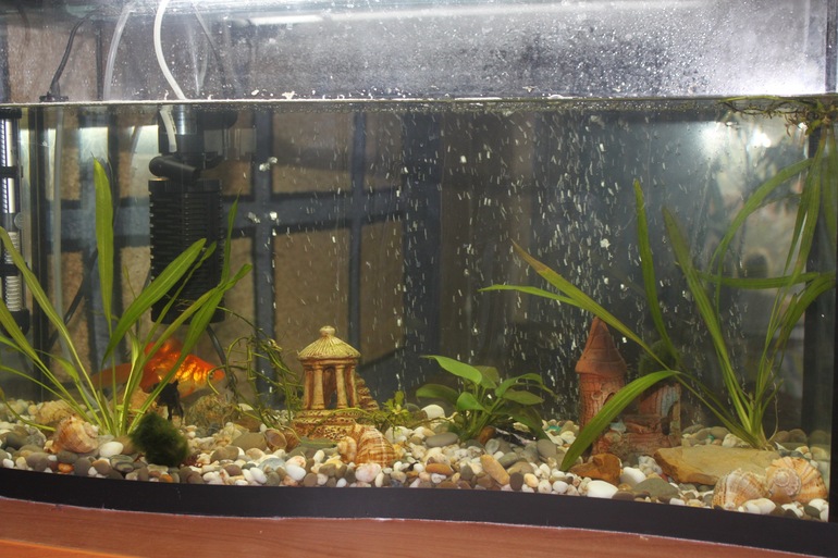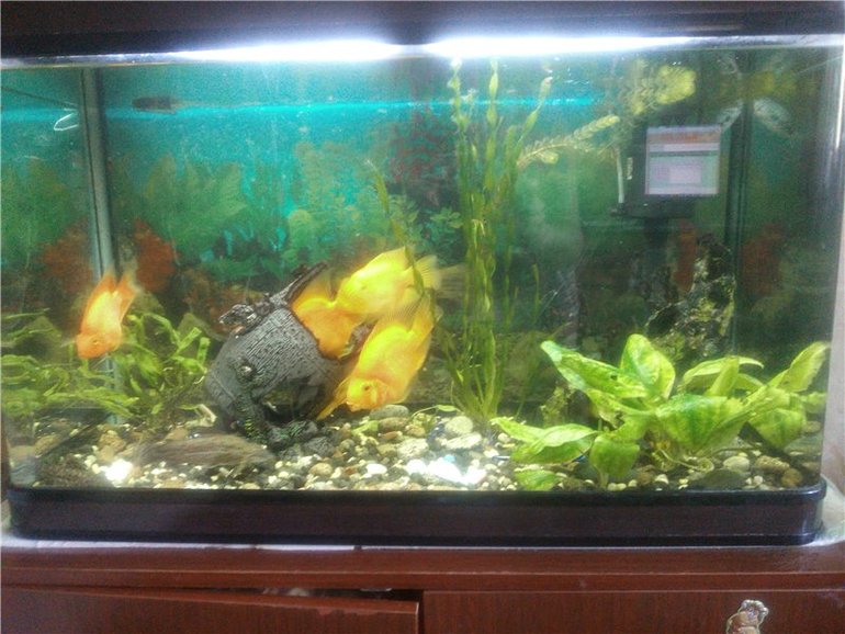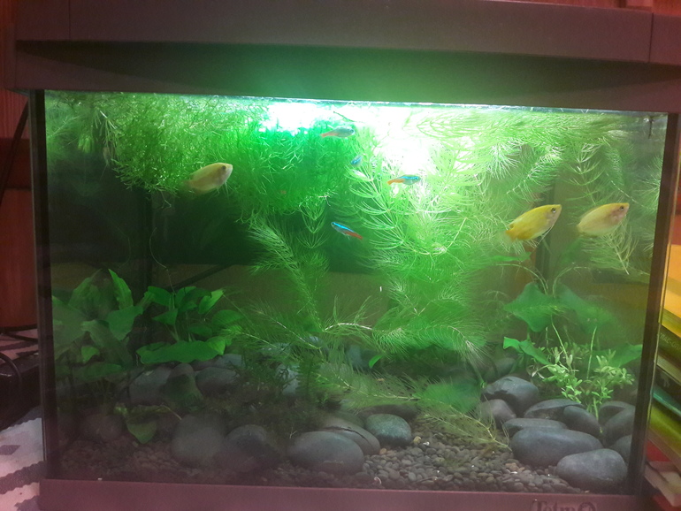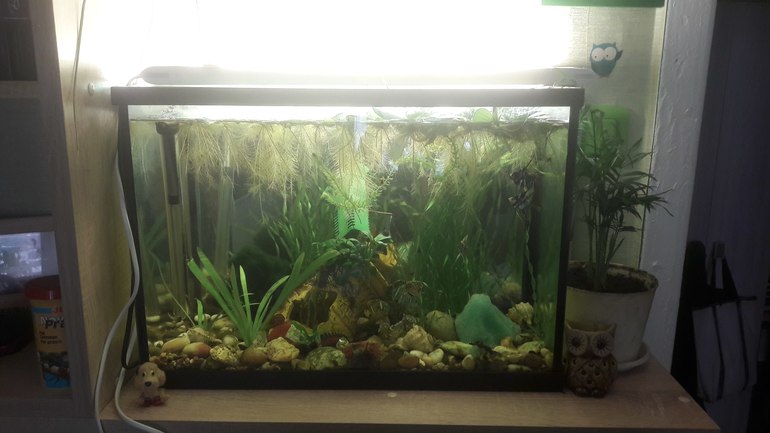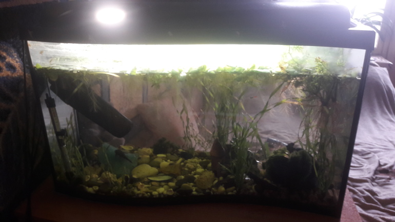 вот аквариум на 40 литров. свет просто дневная лампа. фильтр и обогрев есть,но отключены.