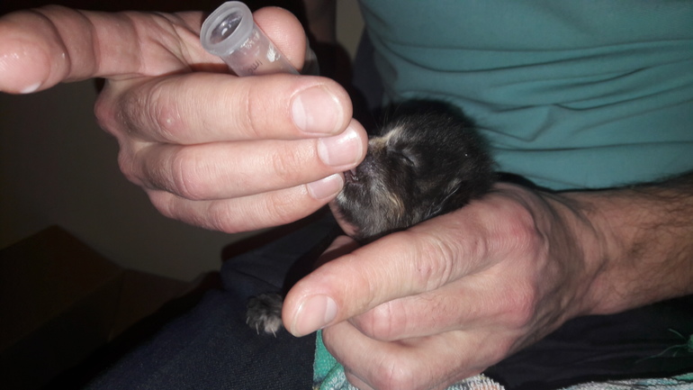 Купили смесь, шприцы, пипетки и вперед! Третий день она у нас. Сосет молочко из пипетки и мило мурлычит у мужа на руках после еды, остальное время проводит в коробке с грелкой, обычно спит.
