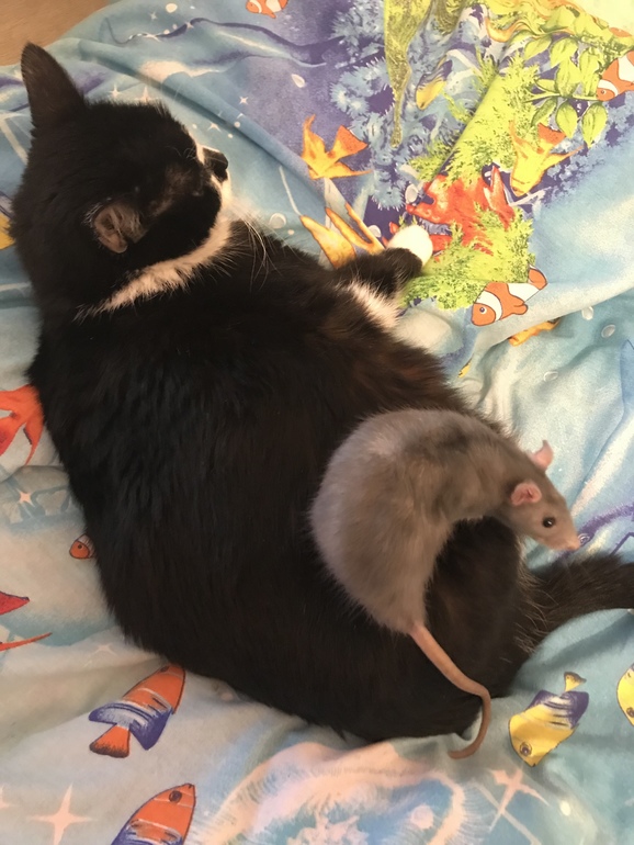 Это наши.Кошке 18 лет,крысе год будет.До этого другая крыса жила с кошкой так же дружно 3,5 года-умер от старости(они не долго живут).Еще были аквариумные черепахи-бестолковые,вода от них быстро тухнет и пахнет по всей квартире или менять воду очень часто.Отдали на зообазу.Кролик был-все перегрыз и г..... полно было))).Хомяк-кусался сильно,всю ночь в колесе бегал и гремел))) и убежал на даче.А крыс-что тот,что этот - умнейшее животное,детей любит,облизывает,на имя отзывается,чистюля.