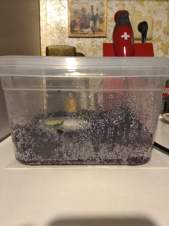 Из того что сделано - куплен контейнер пластиковый полупрозрачный на 6 литров, грунт - кокосовая стружка, глубина 4-5см, пластиковая крышечка куда класть еду - там огурец и натертая скорлупа от яйца. Все обрызгано, дырки в контейнере насверлены, крышка целая.