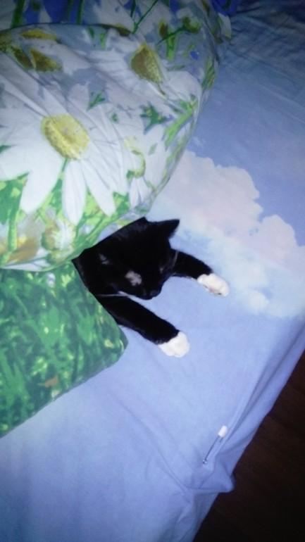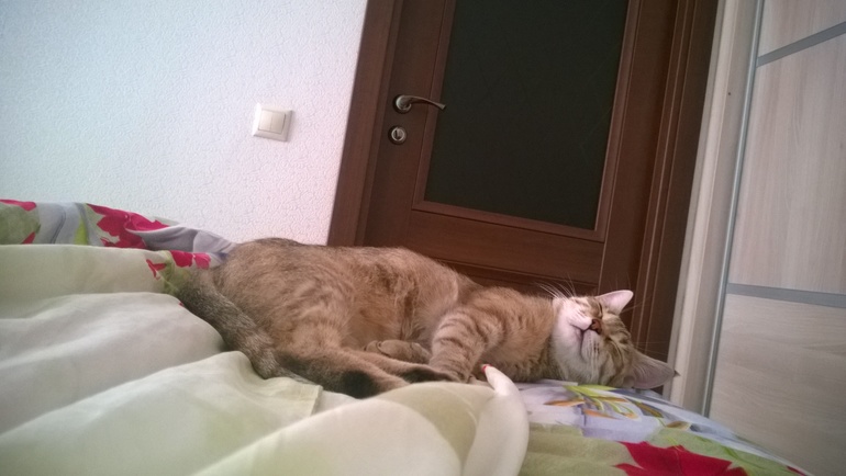 Кот всегда с нами на кровати, но в ногах, а точнее на них. А вот девчонка до сих пор боится с нами спать да и вообще оооочень редко спит на кроватях. Ее, по моему мнению, в прошлой семье гоняли с кроватей, да и вообще она забитая была.