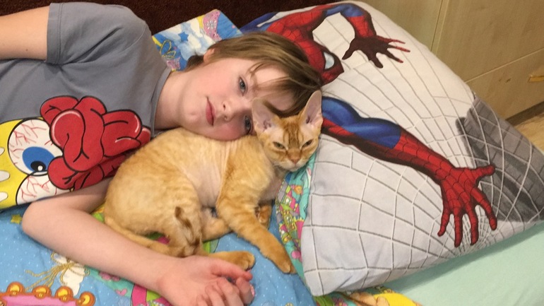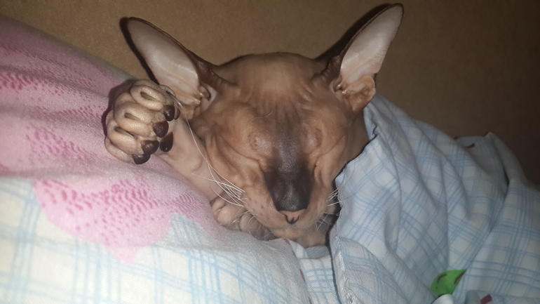 Британец спит у моей подушки или в ногах,старший сфинкс летом спит на одеяле между ног,младший под одеялом рядом со мной.Представьте,как я ночью на бок переворачиваюсь)