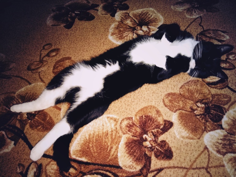 У меня котенок любит спать на спине на коленях) ему пузцо почесывают, а он дрыхнет от души. Даже рот раскрыл, как крепко уснул