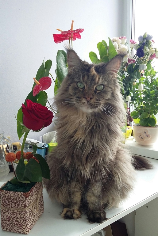 У меня очень скромный опыт- 1,5 месяца у нас живет кошка метис мэйн-куна, лохматость не как у вашей, более короткошерстная.