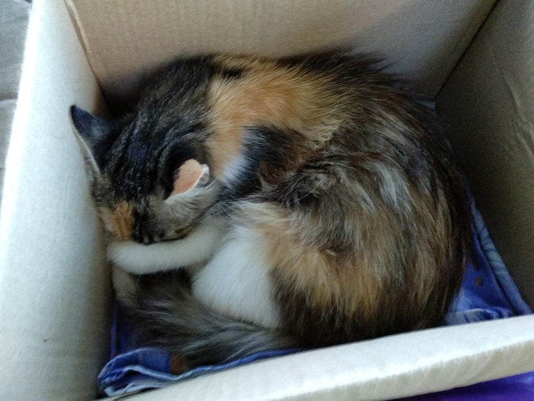 Сразу зарулили в ветеринарку. Девочка (ожидаемо, но вдруг), 6-8 месяцев, почти здорова. Подлечиваем, стерилизуем через 3-4 недели, до прививок.