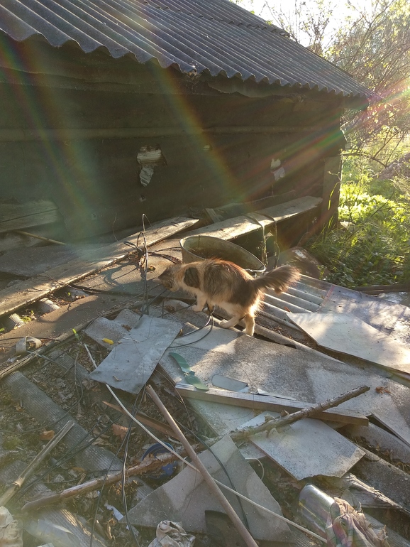 Выделили еды - что нашлось. Животинка на радостях решила, что теперь она живёт тут и пошла шариться по сараю.