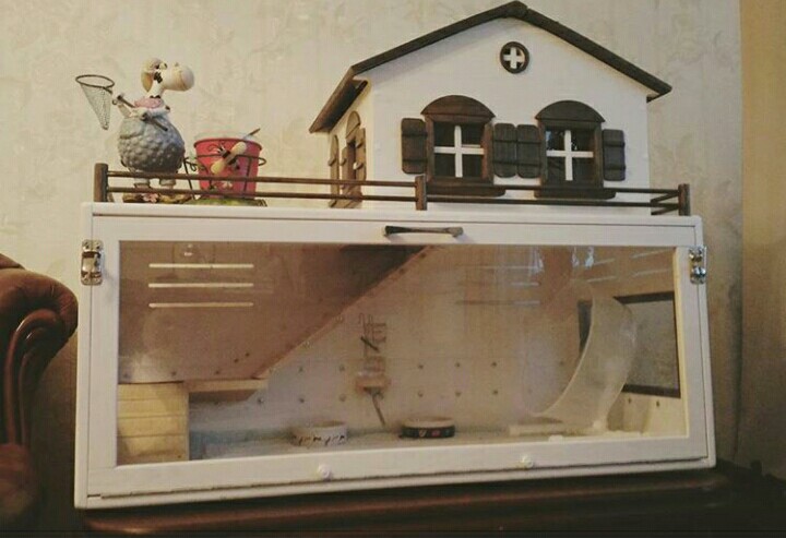 Клетка у нас (дом точнее) 108 на 80. Для защиты от кота можете на заказ сделать. У нас от "мир теремков" двухэтажный дом. (Фотка старая, там ещё ёжик жил, наполнение не смотрите)
