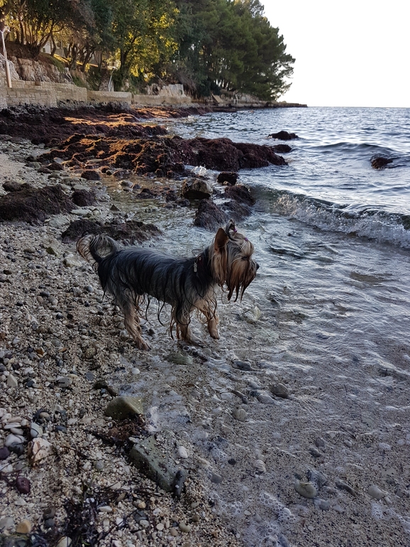 На машине из Загребе доехали до Пореча. Отель наш разрешает размещение с собаками (мы заранее звонили и уточнили). Стоит это 8 евро в сутки, те ещё примерно 8000 руб. за 14 дней. Отель для собаки шикарный! Везде урны специальные с пакетиках, есть "собачий пляж" с душем, много места для прогулок. Да и жить в одноэтажном бунгало с верандой и лужайкой Шундосу понравилось. Мы его везде возили с собой, оставили дома только во время однодневных поездок в Венецию и на Плитвитские озера. Море собакену понравилось. Ежедневно бегал облаивать небольшие волны.