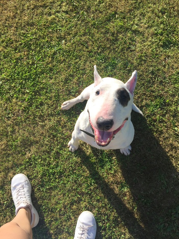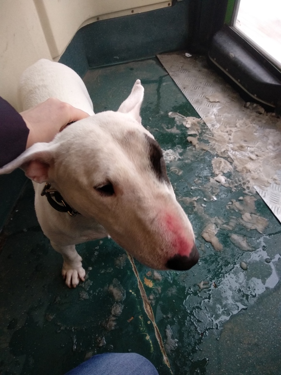 А ещё в этом году я уже успела побыть собаковладельцем. Недолго, но с кучей впечатлений :) Ехала в автобусе ранним утром второго числа, и на одной из остановок зашёл ОН. Пассажиры автобуса резко проснулись, протрезвели и зашевелились - бультерьер без сопровождения и намордника никого не оставляет равнодушным. Псина шлялась по автобусу, её перемещения можно было отследить по испуганным пискам и паническим фразам ))) Поймала, зажала к стенке - морда битая, взгляд потерянный, адресника нет.
