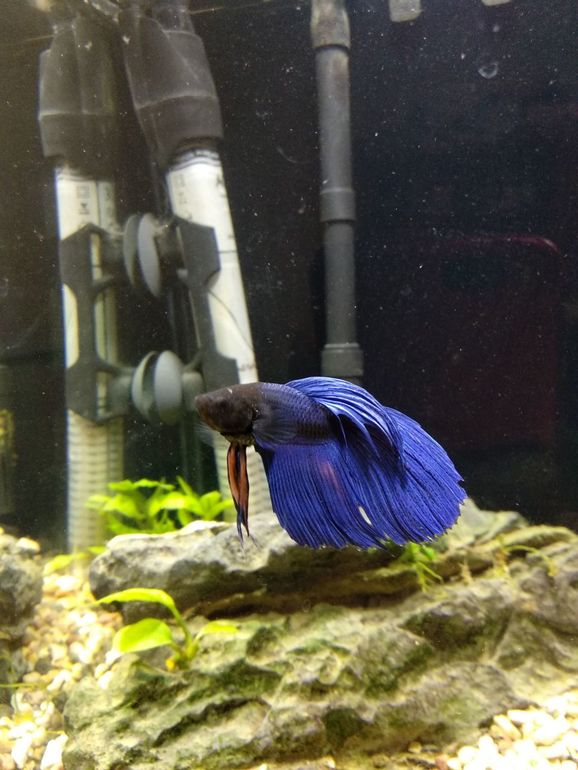 Следующим новосёлом у нас был Илон - петушок. Аквариум с данио и креветками надоел, был подзаброшен, а потом ещё и грунт начал пылить нещадно - решила перезапустить. Насыпала камушки, перезапустила. Сходила в 4лапы, купила рыбу. Меня продавец спросил - а есть ли у меня аквариум для рыбы? Есть.