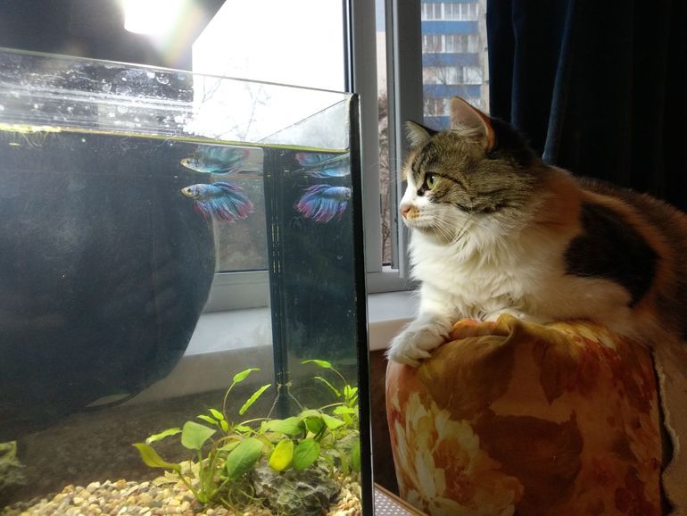 Правильно запускать новый аквариум было некогда, потому рыба с манатками практически сразу и перекочевала в новый дом. Переезд был ужасен, воды было мало, доливала ежедневно по несколько литров. Рыба в итоге была в таком шоке, что покончила жизнь самоубийством, сиганув за борт. Кошки уважительно отнеслись к самураю и жрать его не стали. Мы взгрустнули, сходили за новым Илоном ))
