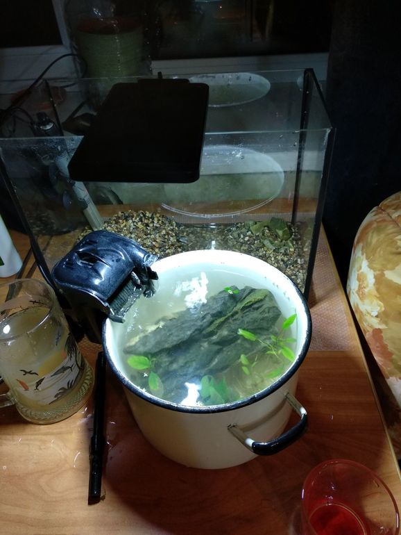 Как оказалось очень скоро - продавец меня сглазил, и много лет стоявший аквариум взял и потёк. Рыба и трава были эвакуированы в кастрюлю, а мы отправились за покупкой банки. Принципиально к конкурентам.