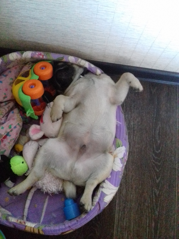 Пердушкой назван неслучайно. Бздит порой так,что глаза слезятся. Хрюкает, сопит и храпит. Хоть и молодой,но на 8 этаж поднимается с одышкой, будто вот-вот лёгкие выплюнет (это раз лифт отрубили).