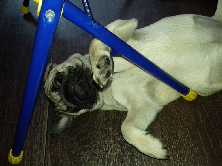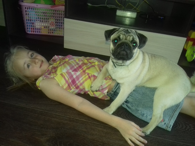 В целом очень позитивный и беспроблемный пес. Не ссаться от счастья только научится-вообще идеал ))