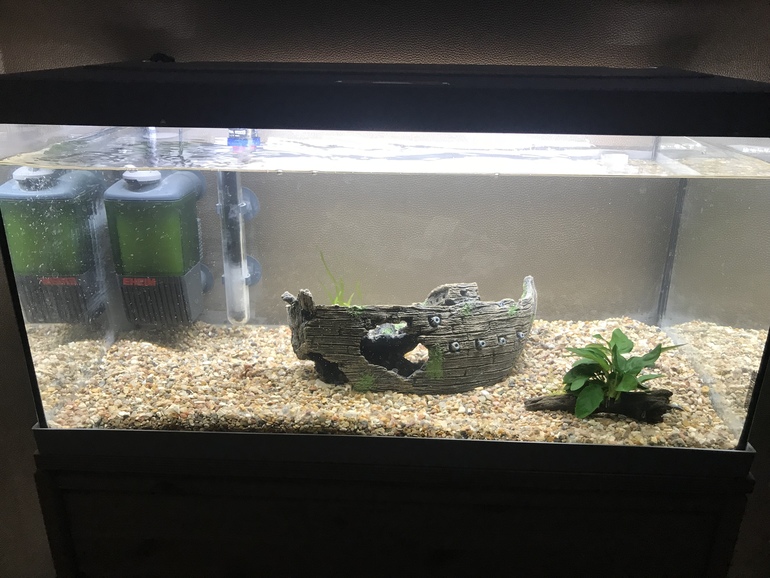 После гибели неончиков я поменяла цветной грунт на обычный камень мелкой фракции и перезапустила аквариум. Кораблик тщательно и долго полоскала.