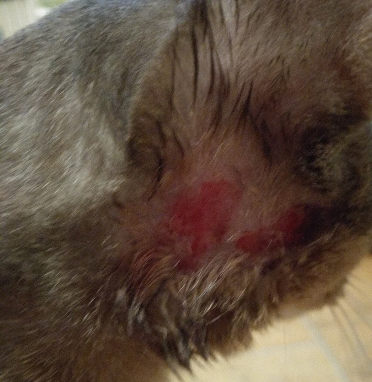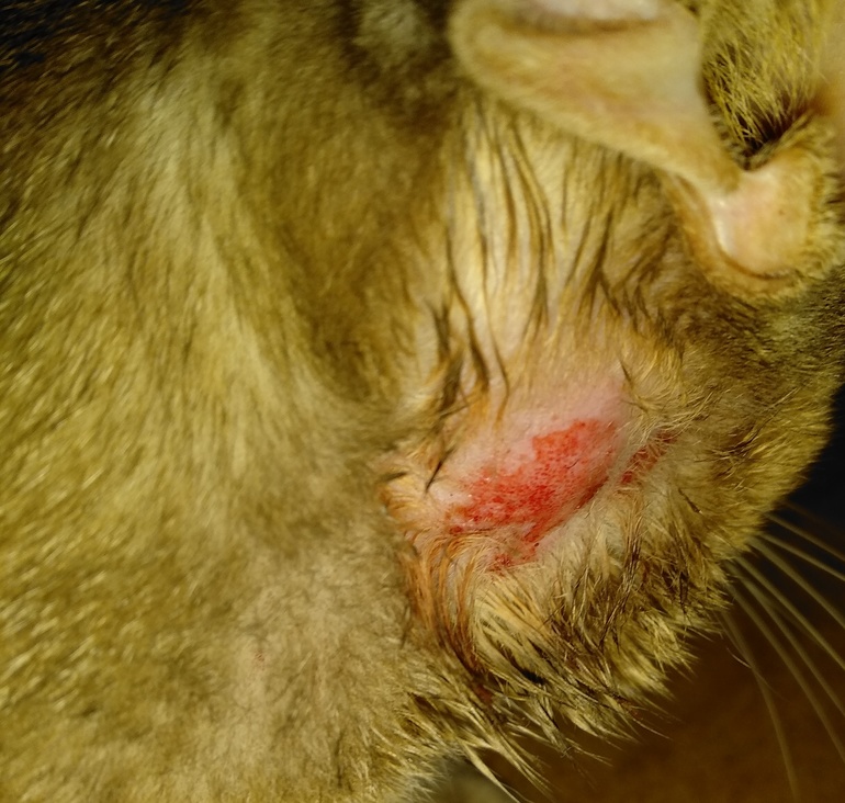 Девочки, не смейтесь, но мы только недавно примерно такое же красное мокрое пятно лечили у мужа)) дерматолог назначил мазь неодерм 2 раза в день. Диагноз - аллергия под вопросом. Вот и думай на что теперь. Так что я поддерживаю мнение всех ниже - скорее всего у кошки пищевая аллергия.