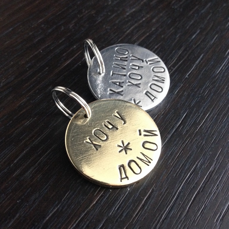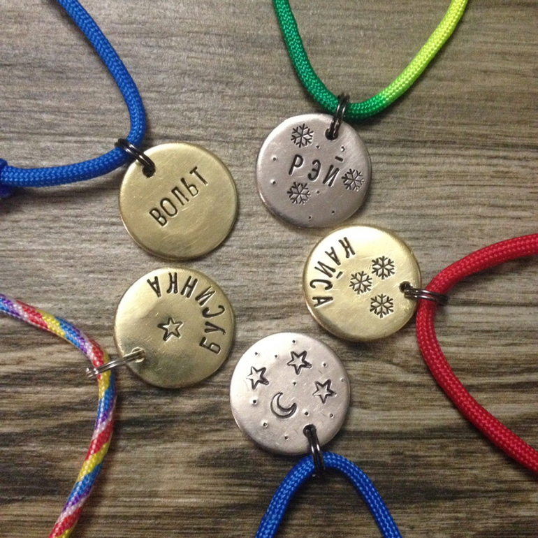 Латунные и медные адресники-жетоны с ручной чеканкой и адресники с цифрами на бусинах.
