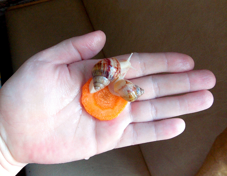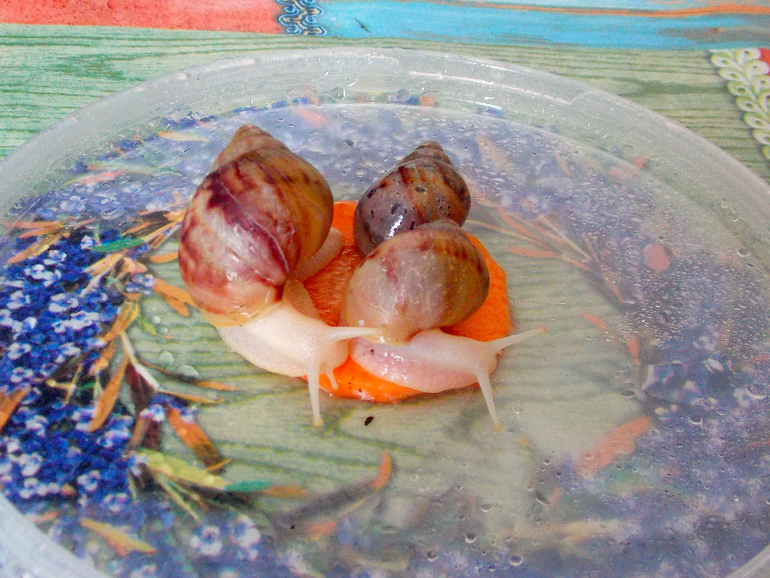 С белым телом - ахатина фулика альбино боди, с чёрной - ахатина фулика стандарт. Миленькие малыши. Но помните, чтобы они хорошо выросли на одну улиточку требуется 10-15 литровый контейнер. И если они будут все у вас в одном контейнере, когда они подрастут ждите каждые 2-3 недели яйца! Много яиц!😂