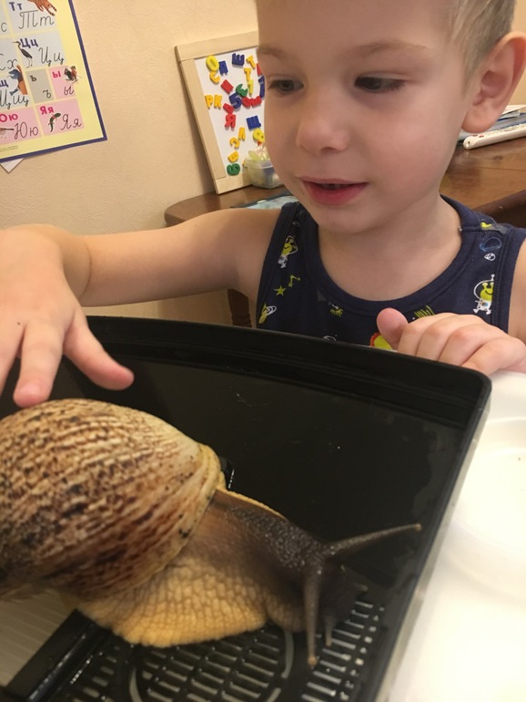 Сын вообще по натуре мне напоминает улитку ( медлительный, если на что-то обижается долго выходит из ступора ( как улиточка, которая прячется в свой домик). Знаю, что эти большие улитки не такие пугливые как обычные улитки.