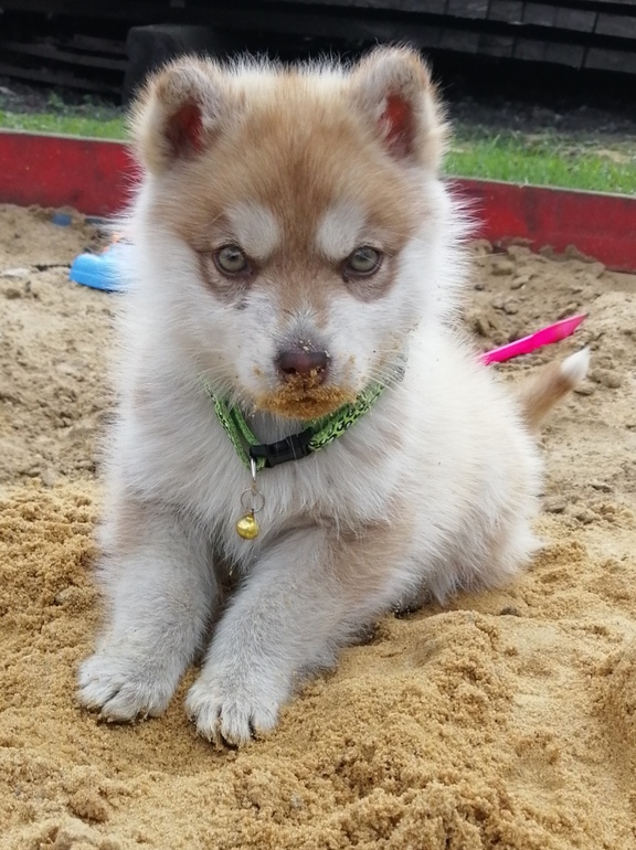 Здесь больше похож. Но лапы, мне кажется, у хаски другие. Эти лапки выглядят лапками метиса, смеси с более мелкой породой. Типа помски.
