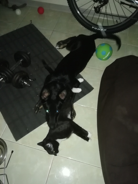 Кошка. Отдельная песня. Фронтовая 😅 Надо было назвать её Дамойгенерал. Во-первых, активная. Постоянно норовит выскочить на улицу. Никого и ничего не боится. На улице подпускает близко к себе других собак, может навалять им, не шипит, а рычит. Дома в ответ на ругань переговаривается, я упорно слышу прям отчётливо: "Да отвали ты!" 😬 Гоняет и задирает пса. На ночь во имя моих комнатных растений и целых штор закрываем в туалете. Приучили там ходить на унитаз - ставим сверху сетку от лотка. Поняла с первого раза. Скоро будем сетку убирать (есть в анамнезе опыт с котом, делающим дела прямо внутрь унитаза, хотим повторить успех). Голосом просит, чтобы открыли туда дверь, ходит в туалет по графику. Продолжает лазить на кухонный стол - не сколько в поисках еды, сколько игрушек: то пакет, то коробка, то ключи... Обязательно скинет на пол, где они с псом эту вещь прикончат. Поняла, кто тут ответственный за корм, постоянно норовит уложиться поближе ко мне😃 Раньше была исключительно папина, поэтому пока в искренность не верю. Также активно играет со всеми псовыми мячиками, палками, кольцами и тд. Стараемся чаще вывозить в переносе, тренируемся к поезду, орёт первые минуты. Хорошо, часы🙄 Выпускаем внутри машины, норовит усесться на панель под лобоым стеклом. Напротив водителя. Во время движения😅 Буду изучать эффект Кота-Баюна.
