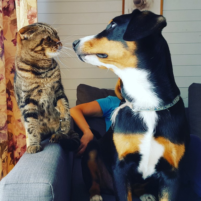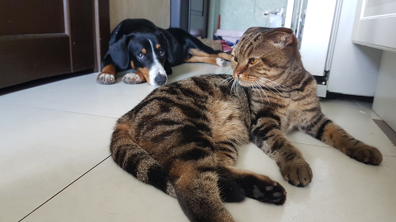 Да он дурашка такой безобидный, донимает бедную кошку своими игрищами наверно.