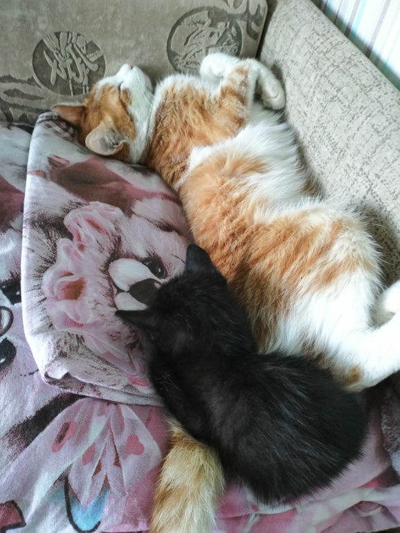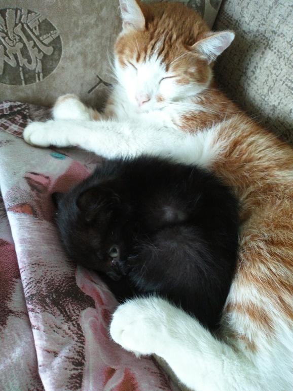 Не прошло и недели, как шипеть стал гораздо реже на малыша. Даже допустил к телу))) мелкий его измором берет, находит даже под диваном, из его миски еду ест)). Короче я начинаю наслаждаться их дружбой
