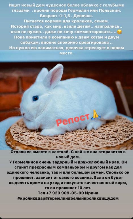 Лена-Леночка в Домашние животные 6 лет Кролик в добрые (очень добрые) руки Они ждут своего хозяина (бесплатно) Все написано на фото Доп.фото пришлю. Как то запутплась как тут прикреплять. Посмотрите еще 20 записей на эту тему Отменить Ответить Кому Чудо-чудное? Тем, кто отдает котят в добрые руки Чаты Беременных Выберите чат: Январята-2026 Февралята-2026 Мартята-2026 Апрелята-2026 Майчата-2026 Июнята-2026 Июлята-2026 Августята-2026