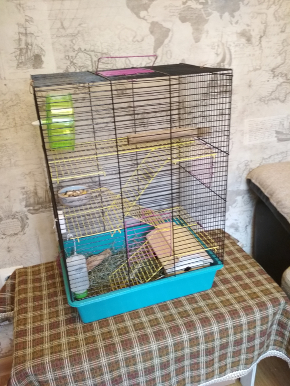 Поздравляю с питомцем! Симпатяга. Клеточка только высоковата. Падать будет хомячок. Они ж равнинные жители. К высоте не приучены. Им в ширь надо побольше. А высота не слишком важна. Главное, чтобы колесо помещалось. А это наша. Джунгарский хомячок.