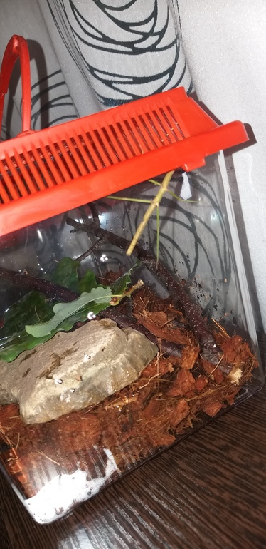 Уход простой,главное наморозить листьев-дуб,малина.Но именно эти ещё приучены к листьям салата.Опрыскивать каждое утро их террариум водой.