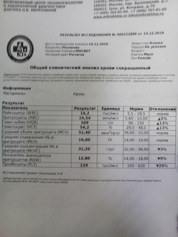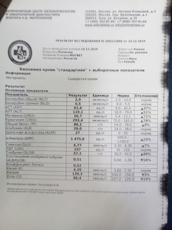 13.12 вечером отвезли в ветеринарку на кожуховской. УЗИ вечером не делают , взяли кровь, поставили 2 капельницы, уколы , оставили бронюлю и отпустили домой . Диагноза толком нет - врач написал гастрит. ,панкреатит , печеночная или почечная недостаточность . В 12 ночи кошка поела , но не какала. Не рвало . Утром от еды отказалась .