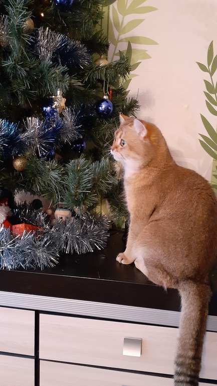 Мой бы тоже залез, но елка колется и царапается сильно и кота это отпугивает от таких подвигов