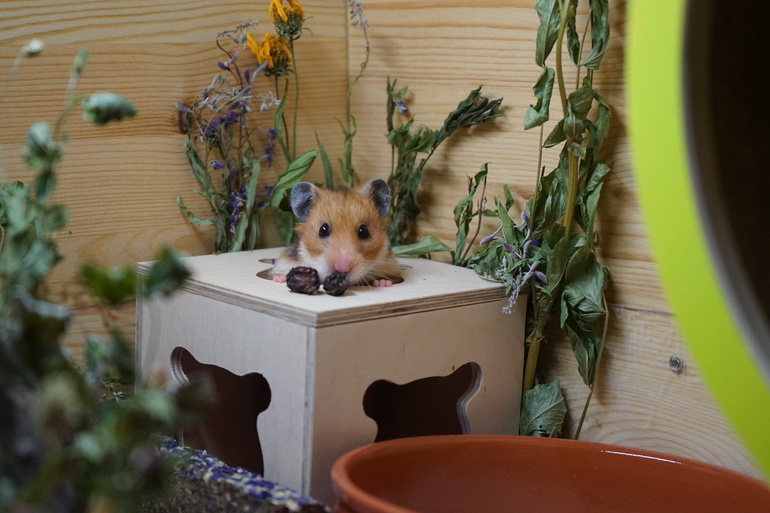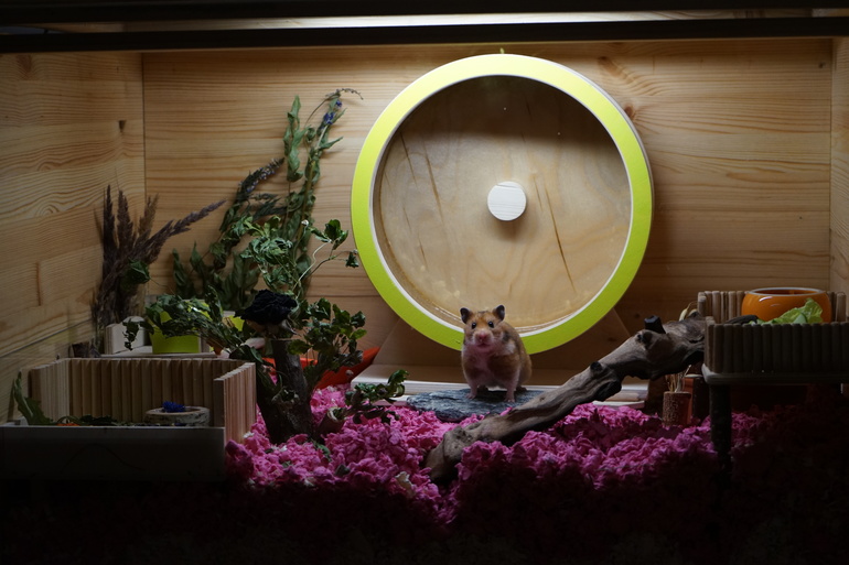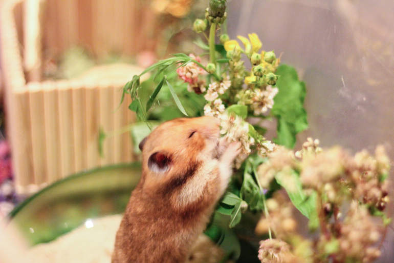 У вашего хомяка не жизнь, а рай. В цветок закапываться можно, игровую сделали, кормят, поят, развлекают.