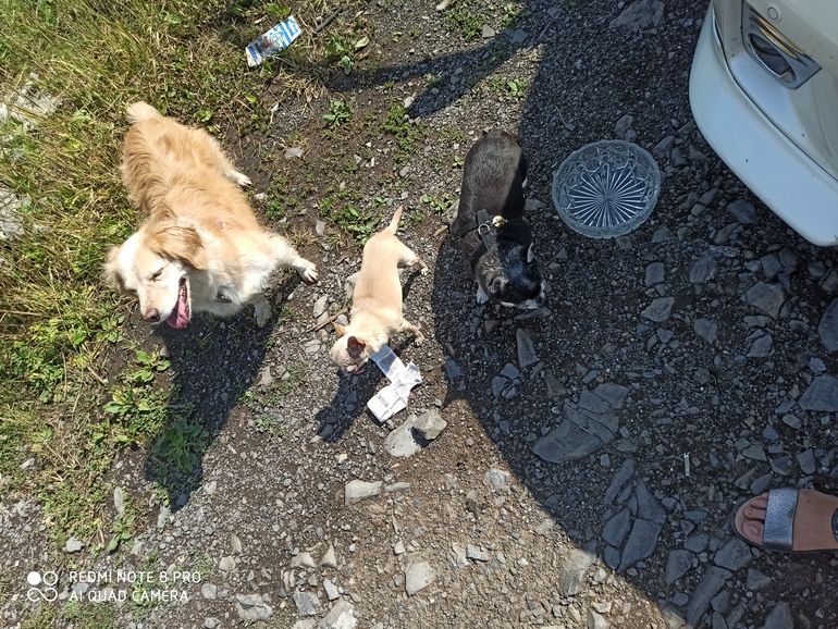 на остановке. Да, собаки пьют из хрусталя даже в поездке)