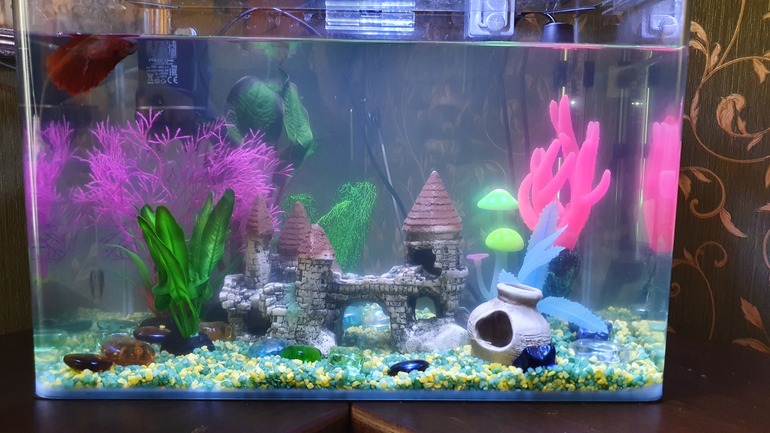 - грунт в виде мелких камешков, несколько искуственных растений и украшалок
