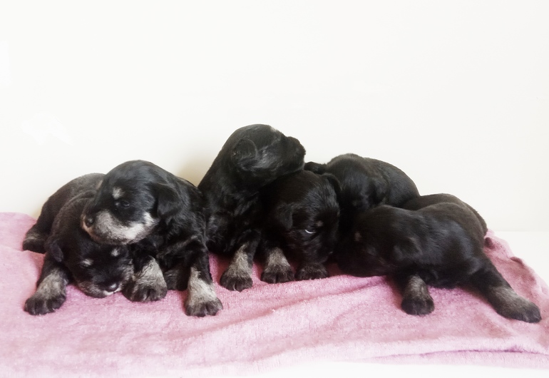 Это окрас черный с серебром, окрас проявляется постепенно. Рождаются в основном черные, а через несколько дней становится видно отрастающие серебристые волоски в местах подпала. Межокрасные вязки у цвергов запрещены) и в браке двух ч/с собак черные не могут родиться. У чёрных может быть расщепление по окрасам и родиться щенки 3 окрасов: черные, черные с серебром и перцовые, но это только если за родителями есть собаки других окрасов.