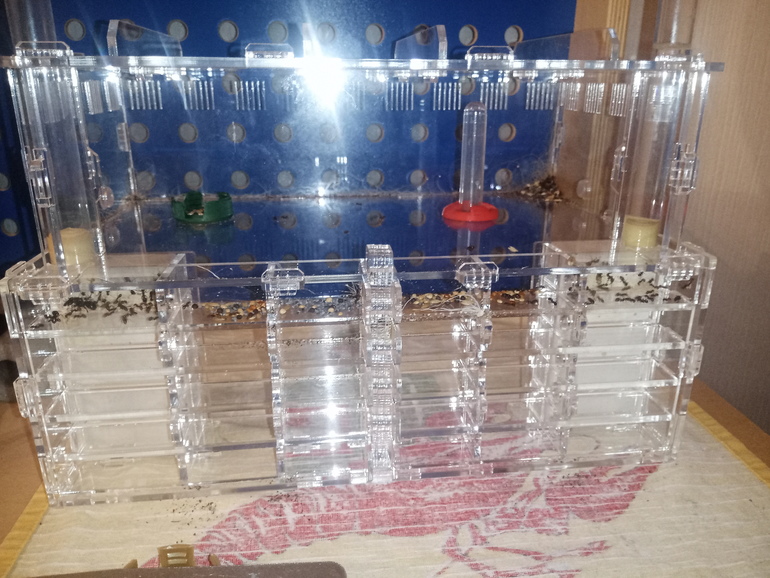Семья разрослась знатно, на днях открыли следующую часть муравейника. Корма, который в наборе хватит на пару лет, 1 раз в неделю даём растительный белок (прям крошка курицы или рыбы обдать кипятком и дать). Наблюдать за ними очень необычно - яйца отдельно складывают, матка прям большая (~1.2см), рабочие муравки суетятся. Корм разобрали по виду зёрнышек и разложили по разным местам. Мусорка у них организована в дальнем углу, чистюли. Сын следит за влажностью (колбы должны быть полными) и водой. Хлопот не доставляет, оставляли на 2 недели летом - всё отлично. В принципе интересная покупка.