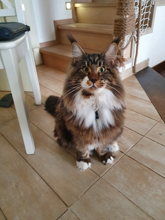 Очень болтливый и вставая на задние лапы открывает везде двери, просто нажимает лапами на ручки дверные)