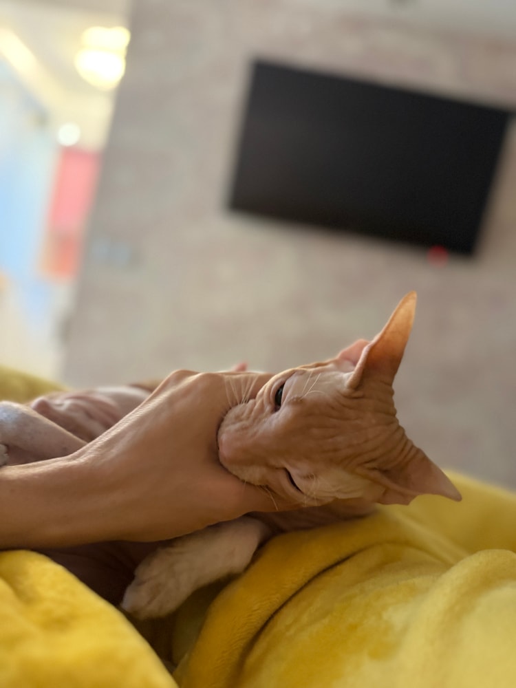 у меня свин (сфинкс) но не полностью голый, кожа как персик , есть очень короткие волоски. Характер хулиганский- он прям мальчишка штаны на лямках. Везде залезет , все пожует , неуклюжий на мой взгляд и оооочень любит обниматься, лезет с боем , когда ему нужна любовь. Сейчас я уже много лежу и не могу ему предложить живот , всегда поворачиваюсь на бок, он находит местно , хоть и не удобно , все равно залазит на меня. За ночь раза 3 приходит мурчать и обнимать , мне с ним неудобно , я прячусь.