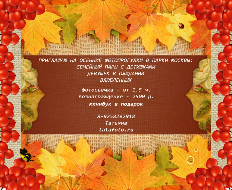 Татьяна Расстановки в ФотоТрадиции 11 лет Приглашаю всех на осенние фотопрогулки в парки Москвы ПРОЕКТЫ ФОТОГРАФОВ Посмотрите еще 20 записей на эту тему Отменить Ответить Kristina А напишите подробнее? Просто выбираем парк и гуляем?)) 03.09.2014 Ответить Экспресс фотопрогулка 1 час. 6 сентября 2014 г. +79637779603 Новый год 2015! Чаты Беременных Выберите чат: Январята-2026 Февралята-2026 Мартята-2026 Апрелята-2026 Майчата-2026 Июнята-2026 Июлята-2026 Августята-2026