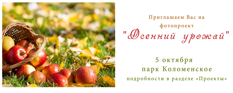 ПРОЕКТЫ ФОТОГРАФОВДорогие друзья! Мы рады пригласить Вас на красочный семейный фотопроект на природе, который состоится 5 октября в парке Коломенское. Для Вас будут созданы красивые декорации на тему осени и сбора урожая. Приходите со своей семьей и приглашайте друзей!