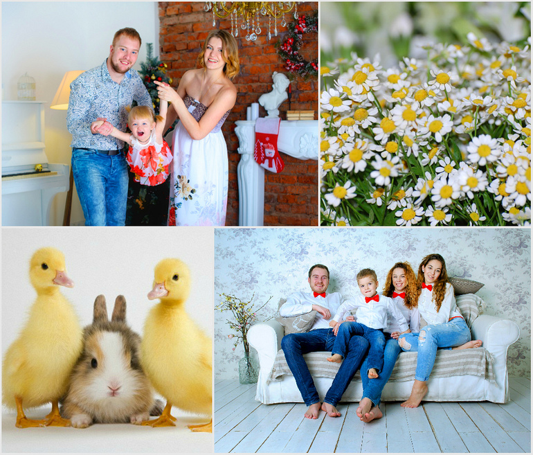 В интерьерной студии оборудованы 4 зоны для съёмки (от спокойной классики до сеновала и великолепной декорации с огромной луной), каждый сможет найти себе уголок по настроению). Ну а забавные лапки и кроличьи ушки не оставят равнодушными ваших деток!