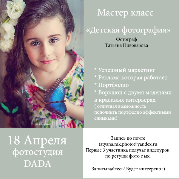 18 Апреля в фотостудии DADA пройдет мой мастер класс по "Детской и семейной фотосъемке".
