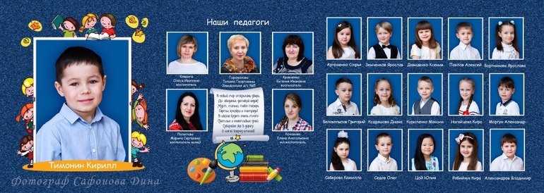 В альбоме будет большой портрет вашего ребенка, и несколько фотографий,на которых он играет, веселится с друзьями, осваивает первые прописи, ну и конечно прогулка. Всего 3 разворота.