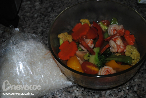Муж меня иногда балует - приносит на обед вот такую порцайку из ближайщего ресторначика на Чалонговсом кольце. овощи с креветками - 100 бат, рис - 10 бат.