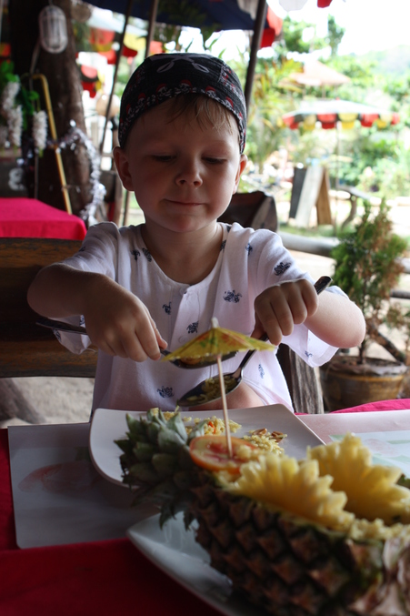 Заказали рис в ананасе с креветками, традиционный салат сум-там и свежевыжатый сок гуавы. Вкуснота! Налопались и в обратный путь.