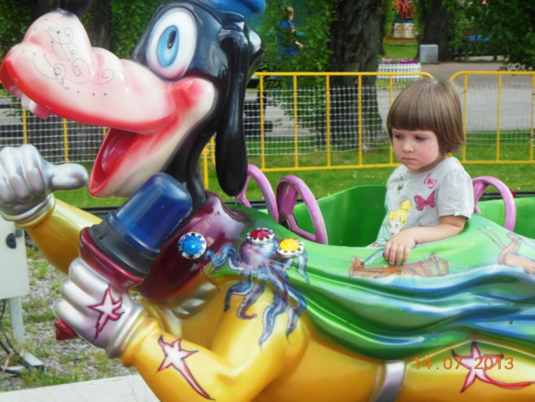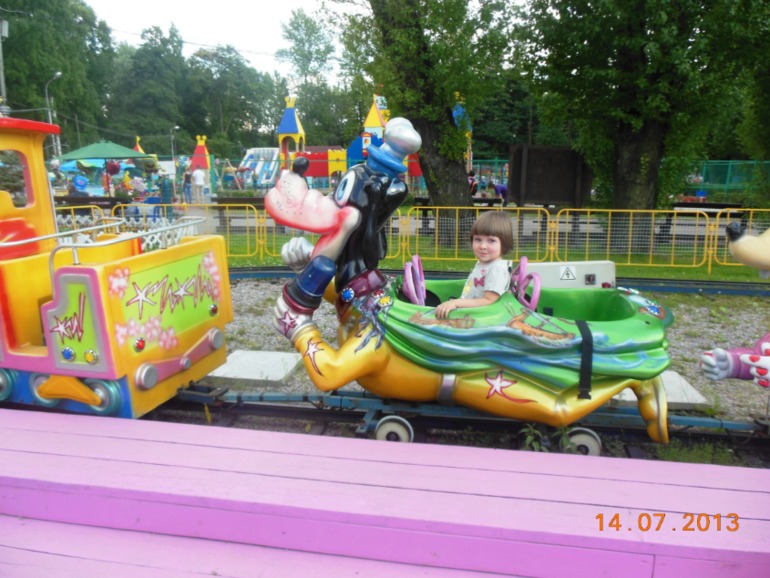 Потом на паровозике Вжик. Крис сначало замерла и дулась, когда чужая тетя ее садила)