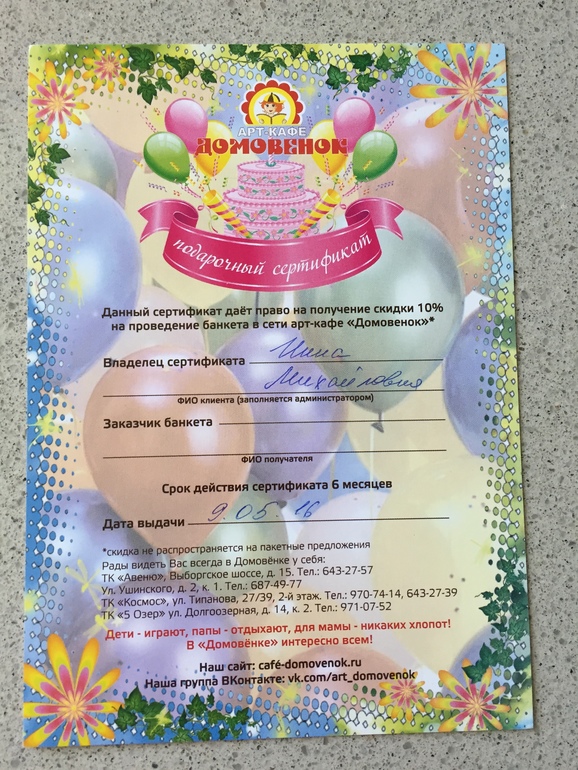 Девочки, если кому то нужен, забирайте! Мы там отмечали 3 годика в ТРЦ Рио, но адресов несколько, все на сертификате, до 9 ноября действителен.
