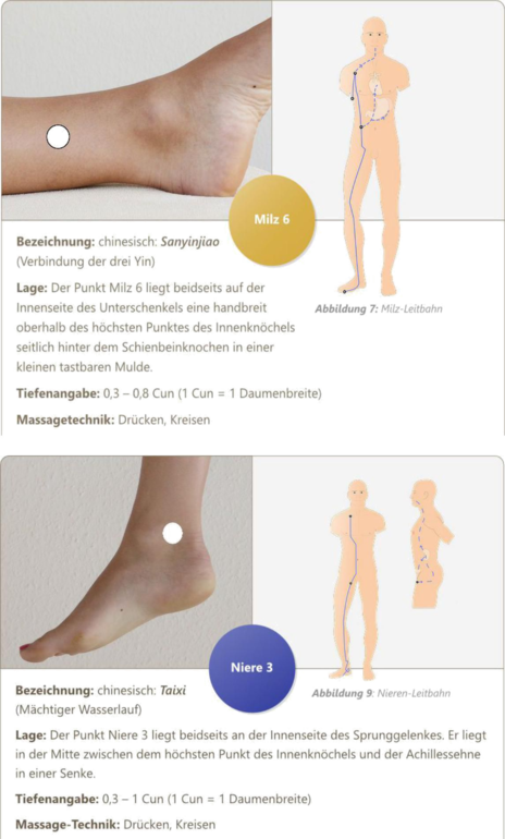 Следующие фотографии взяты из моих акупрессурных книг и поэтому не имеют особой маркировки для планирования беременности. Тем не менее, они являются правильными точками. Не удивляйся ходам и названиям энергетических каналов или точек (селезенка 6, почка 3, печень 3 или сердце 7). Эти имена не должны раздражать тебя и имеют относительно мало общего с фактическими органами, о которых ты, возможно, думаешь. Поэтому, пожалуйста, не растолковывай ничего и поверь мне, эксперту по фертильности, что я тщательно выбрала точки для женского цикла.