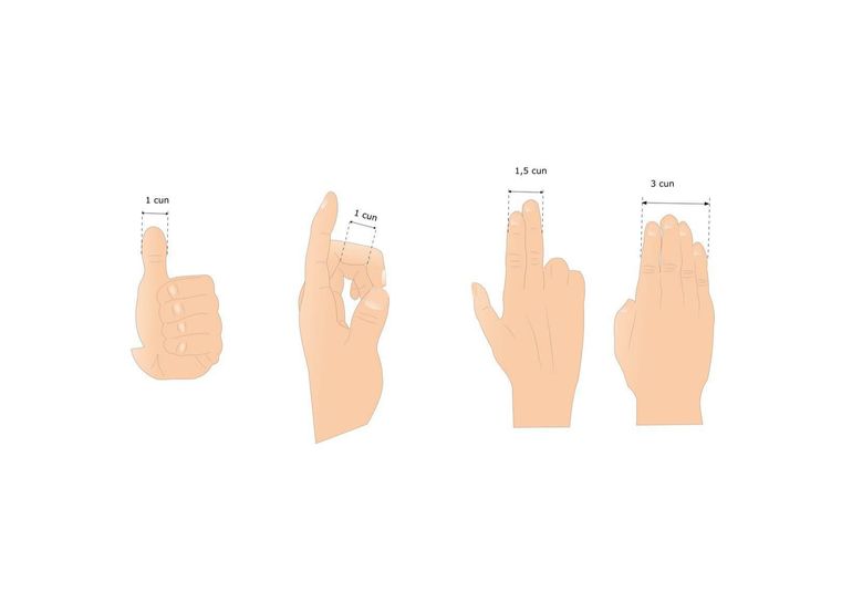 Акупунктура и точечный массаж индивидуально адаптированы к людям. Это относится не только к нахождению точек на поверхности кожи, но и к определению глубины обработки. В КТМ есть размер тела "Cun", с которым указаны расстояния от точек до ведущей конструкции, который, в отличие от других единиц измерения, учитывает наше индивидуальное телосложение. «Cun» может быть «преобразован» в ширину пальцев, которую непрофессионалу будет легче понять. По этой причине ширины пальцев часто используются в описании точек. Самый простой способ - посмотреть на свой большой палец. Лучше всего запомнить ширину самого толстого сустава на большом пальце. Это соответствует так называемой цунь, твоей единице измерения для точечного массажа.